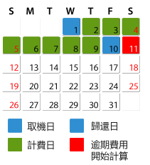 收費只計算在目的地之旅遊的天數, 借咭日及還卡日為前後一天