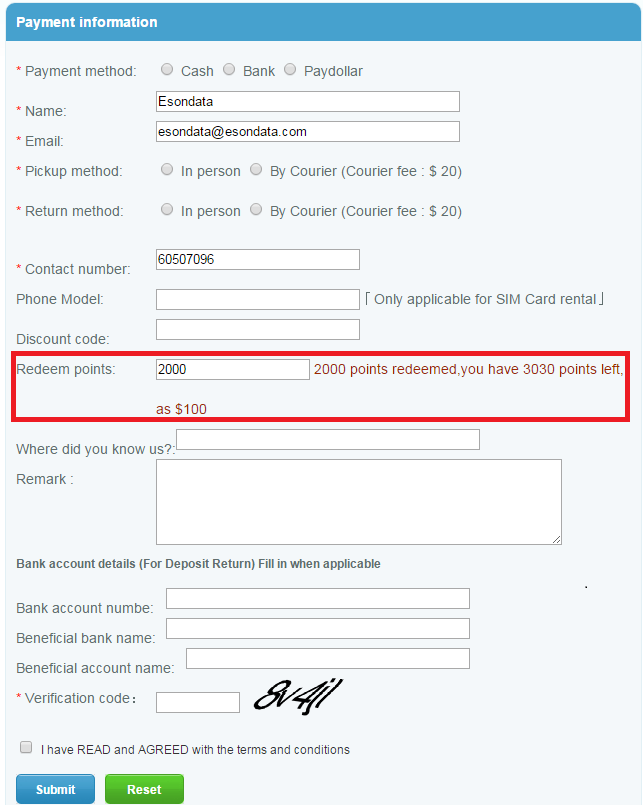 You will earn 1 point for every HK$1 spending in Esondata website (Only for rental fee)