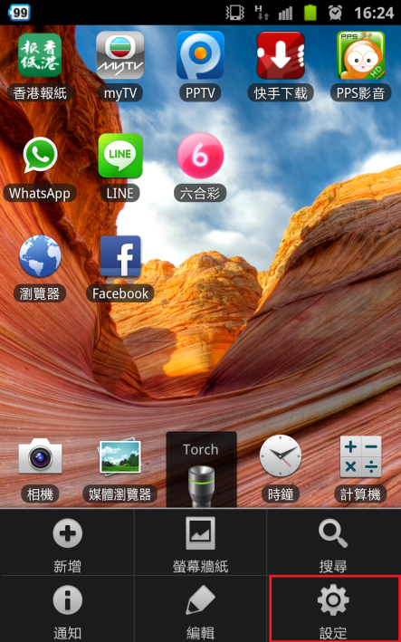 1.在主畫面中,請點擊功能表按鈕,然後選擇 [設定]