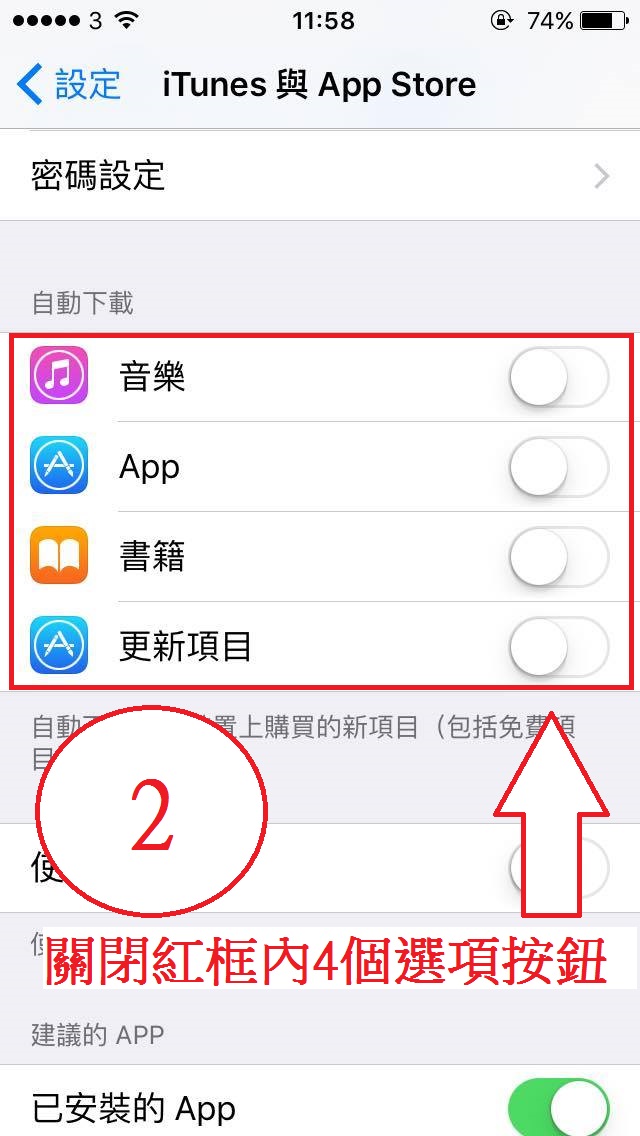 2. 關閉iTunes與App Store等更新 3. 關閉iCloud數據同步 4. 關閉WhatsApp數據同步