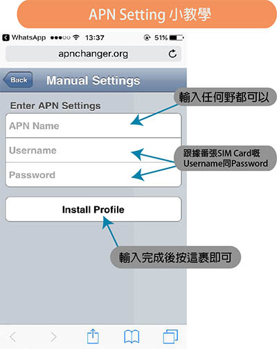 進入網頁後 只需按指示輸入相關資料 輸入後按 "按裝檔案" 或 "Install Profile" 即可